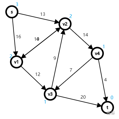 void bfs() { int fro, i, ito; que.push(t); deep[t] = 0; ++gap[deep[t]]; while (!que.empty()) { fro = que.front(); que.pop(); for (i = head[fro]; i != -1; i = node[i].next) { ito = node[i].to; if (deep[ito] == -1) {//不要特判边权为 0 deep[ito] = deep[fro] + 1; que.push(ito); ++gap[deep[ito]];//别忘了给 gap 加 1 } } } }有了这个深度有什么用呢?能让我们找到的增广路一定是最短增广路。