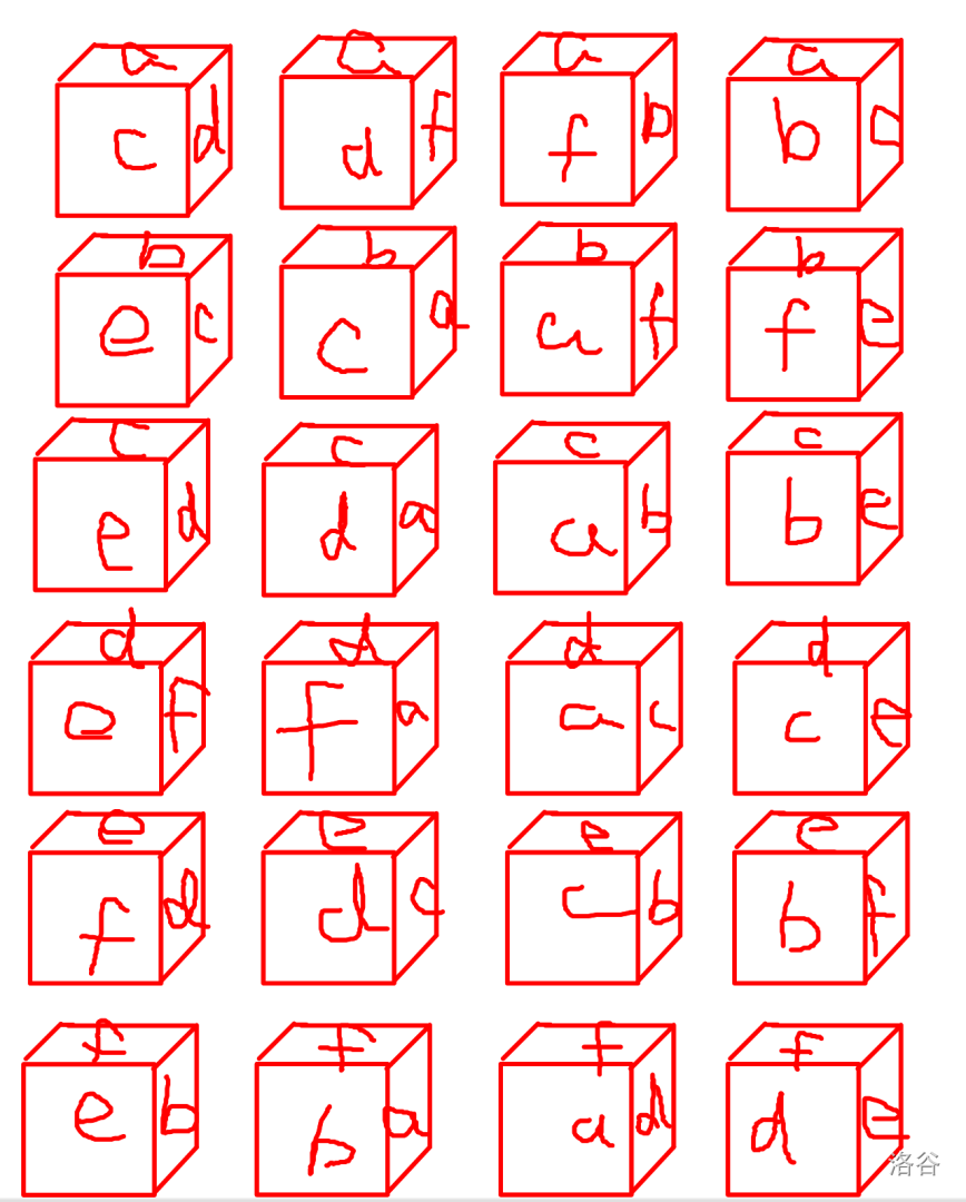 来映衬上面暴力的枚举:直接枚举每一种拍摄角度,判断是否和条件吻合即可,不过我们需要一些准备。首先,我们计算不同角度拍摄的方案总数:一共有六个面,对于每个面在顶上,一共有四种拍摄角度,即:。