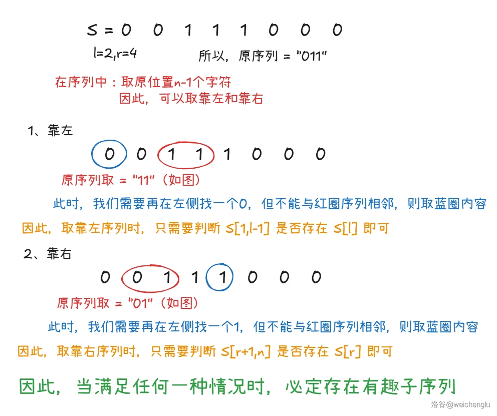 综上所述:"有趣子序列"存在的充要条件是: 在 中出现,或 在 中出现。(如图)