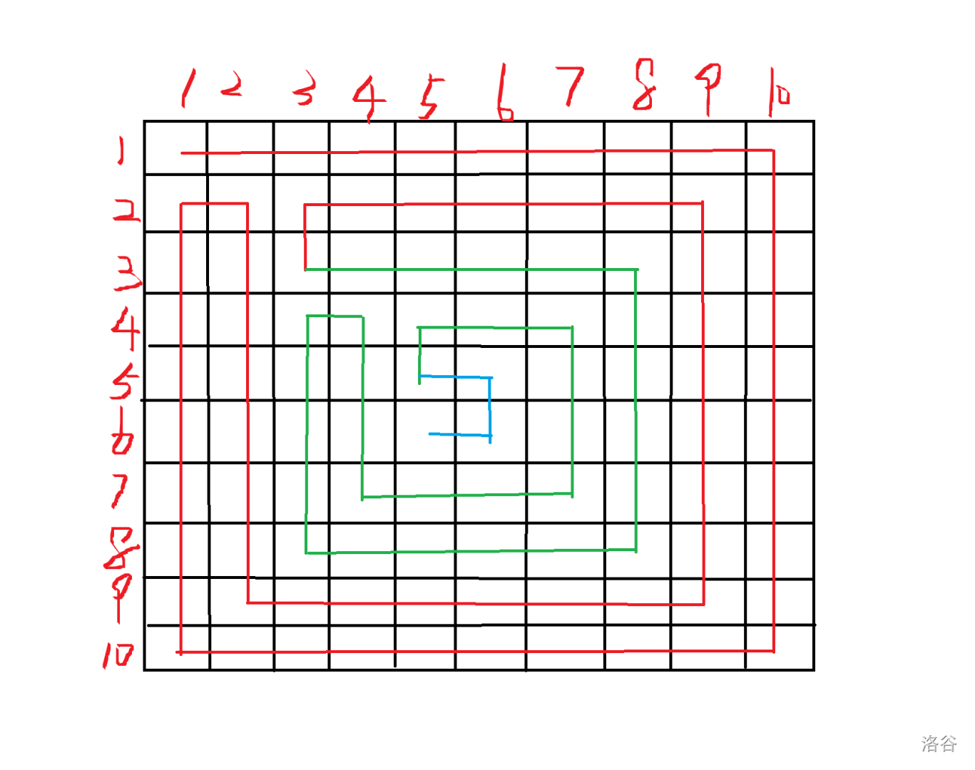 请你用 到 之间的整数,依次填充一个 的方阵。由题目中给出的两张模板方阵得知,我们需要从外到内顺序填入数字。