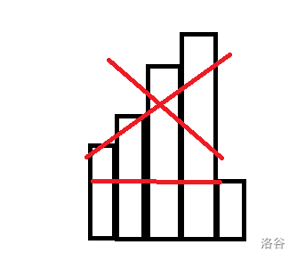 所以我们看回这道题,我们可以利用上面的结论,如果下一个矩形的高度比上一个小,那么该矩形想与前面的矩形拼成一个更大的矩形,那么之前的矩形高于当前矩形的面积就没有任何用处了(如下图中打叉的部分)。