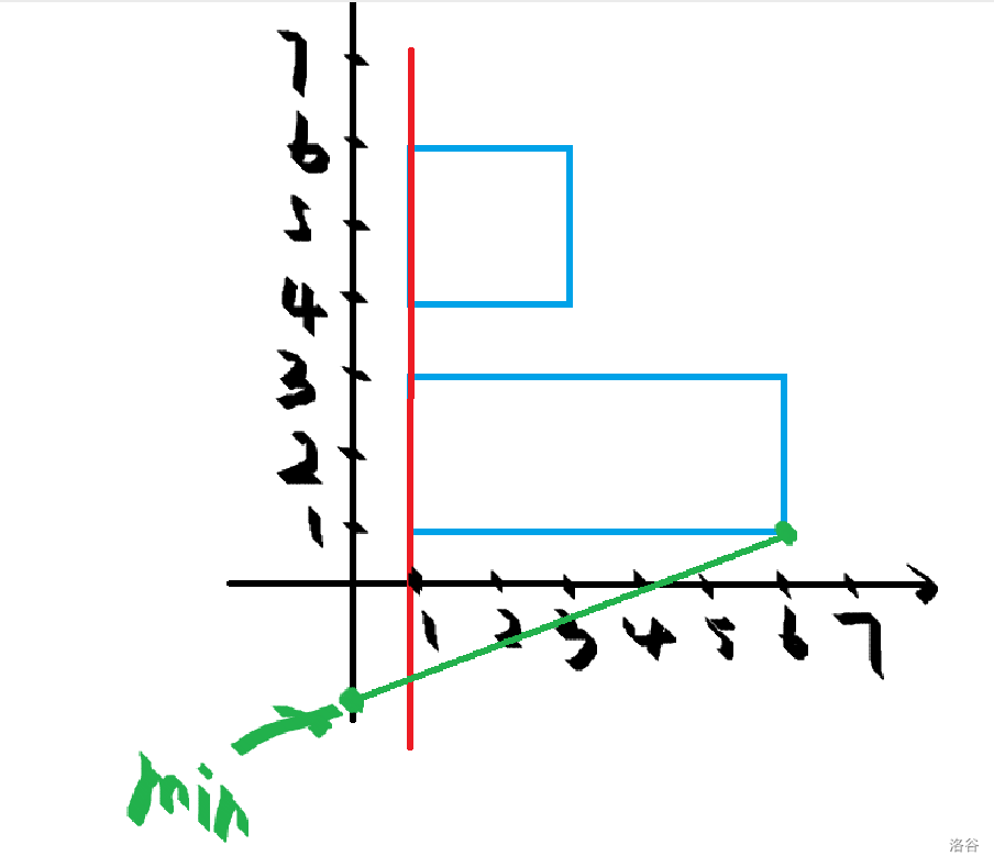 假设我们当前二分到这个绿色的 min 点,我们要保证所有奶牛的位置大于等于它。拿所有奶牛的斜率算位置有点麻烦?那我们就考虑拿斜率比较呗 qwq。我们把点 min 与所有矩形上的顶点连一条边(图上仅连了一条),我们可以计算这些边的斜率。显然,一个奶牛的位置在 min 之上,当且仅当这个奶牛的斜率小于等于我们所计算的斜率。
