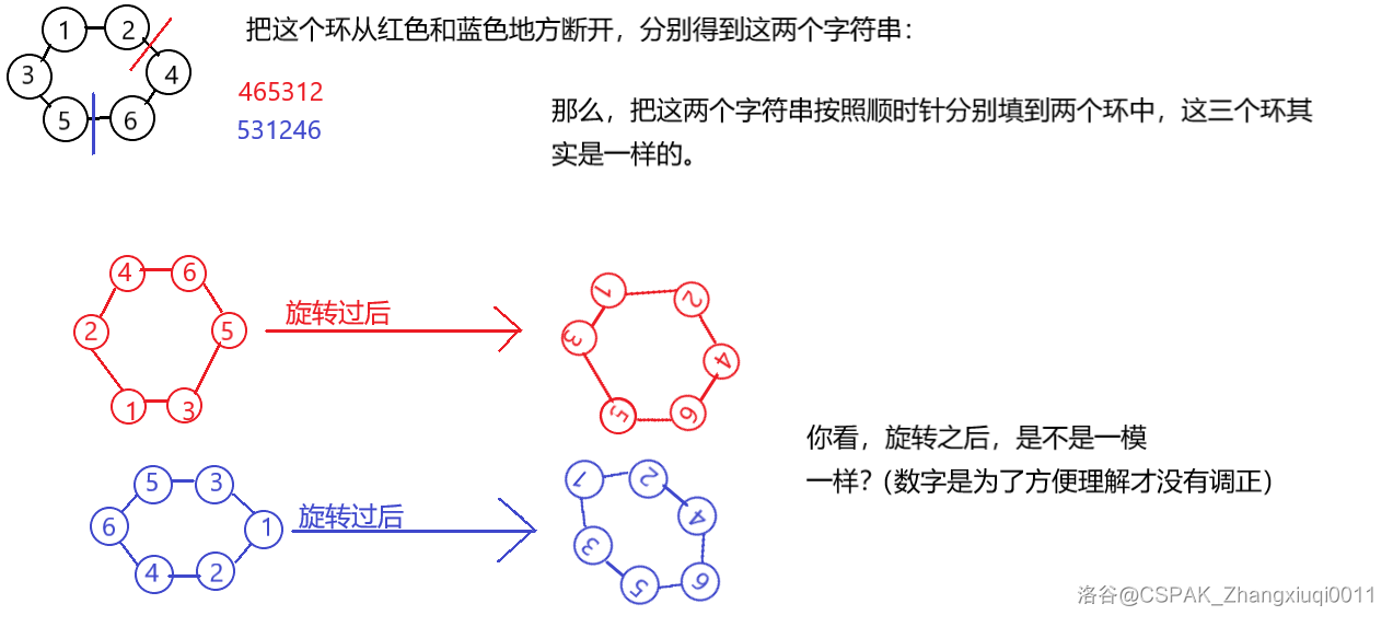 首先,我们确定了本题其实就是字符串的同构问题。那么什么叫做同构呢?通俗易懂的说就是像题目中说的那样,把一个字符串顺时针(当然逆时针也可以)写到环上面,则无论从哪一个地方断开按照原顺序读,这两个字符串在按照同一顺序写在环上面以后是一样的。具体见下图: