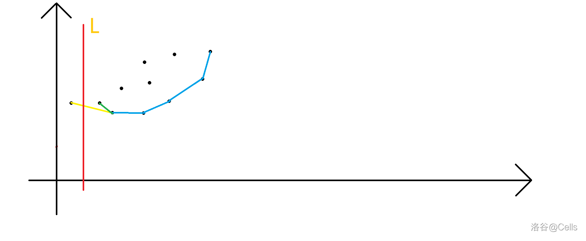long long,需要开__int128,同理前缀和 数组也会爆。并且由于只给定 ,要求区间的右端点 ,所以 ,但是因为全局的凸包和 右边的凸包可能长相不一样(绿色和黄色):