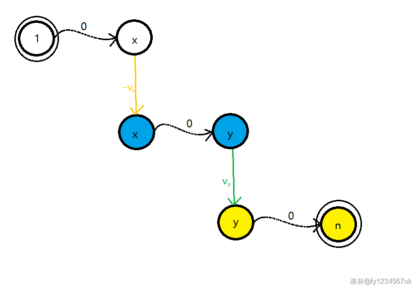 指向点 所能到达的点(在第二层图上)指向第三层的点 。它表示:假如我选择走了这条边,就是我在这个点卖了这个水晶球,我不会反悔,并且我接下来考虑走向终点。