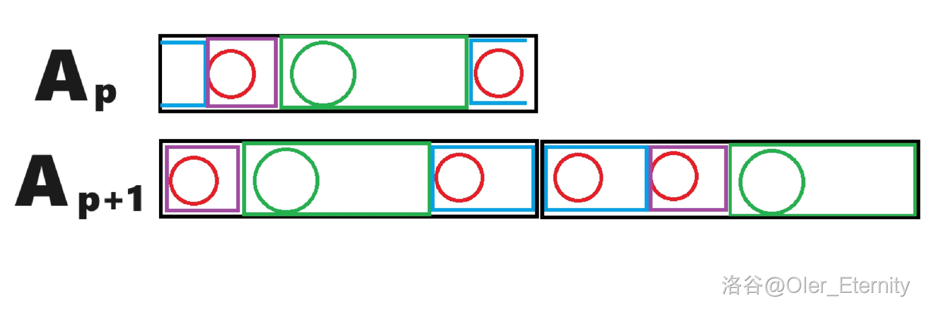 如图,若设红色的圈表示在 中「被标记的」的位置,绿色的圈表示 中新出现的「被标记的」的位置,则各个颜色所代表的矩形对应相同,且各矩形的前缀和一定大于 。