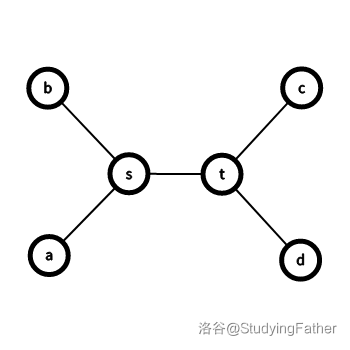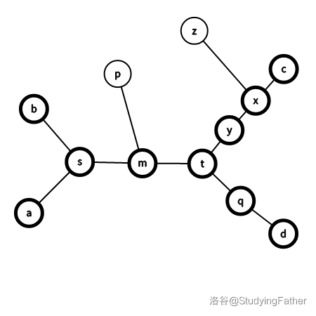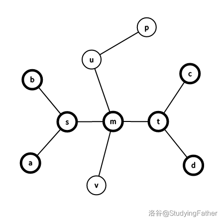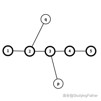 于是实际情况大致如下图所示(略去了树上的其他不必要点,不妨设 位于更靠近 的一侧)。
