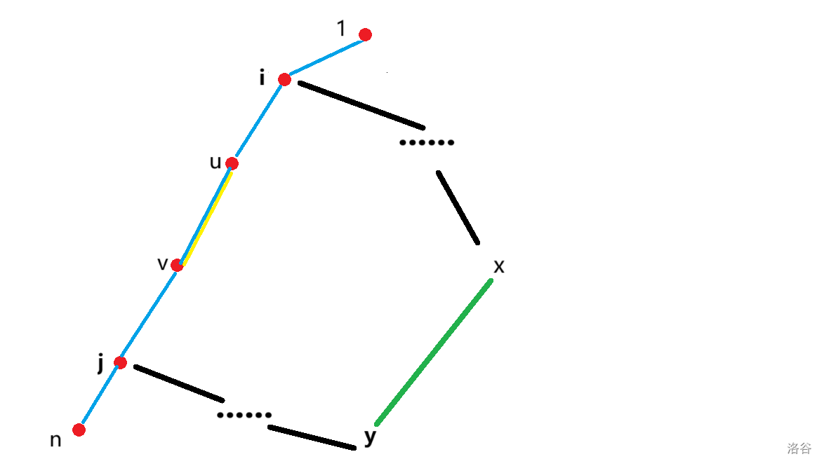 假如 不在树上 到 的路径上,此时的最短路就是原来的 ;否则,最短路可能是 ,也可能是经过一条非树边 的路径,如下图: