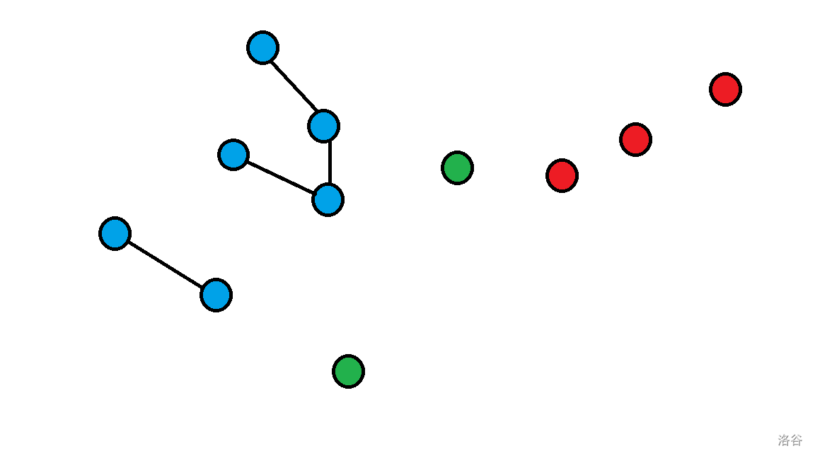 因为这个题目中每条边都只被给出点的最短路径经过了一遍,因此,我们先将输入的点对直接建边(如下图蓝点),然后把剩下的点(下图红点)放在一边,再取出一对输入的点对(绿色点):