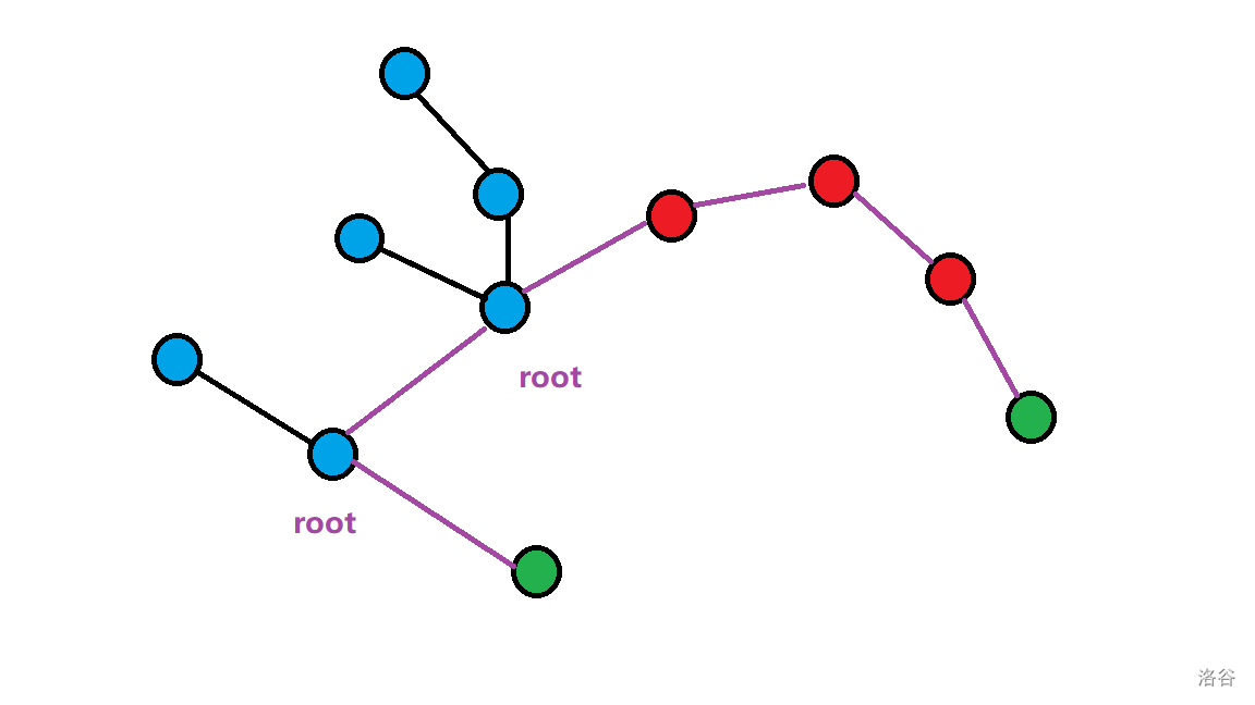 然后将绿色点作为头和尾将剩余点或树根串联起来,如图: