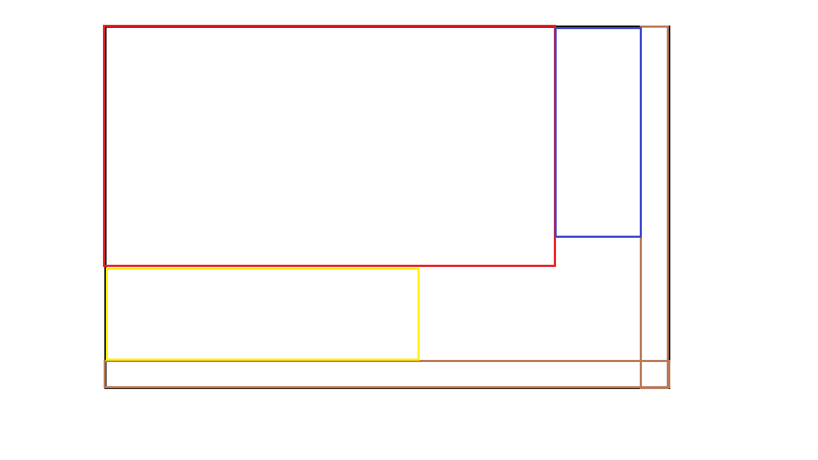 我们考虑在线性基矩阵中为 的格子的形状,我们会发现左上角有一个矩形可以填满(对应下图红色部分),然后紧接着右边有一个矩形使用我们得到的矩阵一来填满(对应下图蓝色部分),然后接着下方有一个矩形可以用我们得到的矩阵二来填满(对应下图黄色部分),棕色的部分的厚度是 。