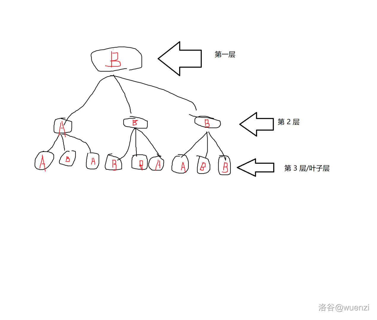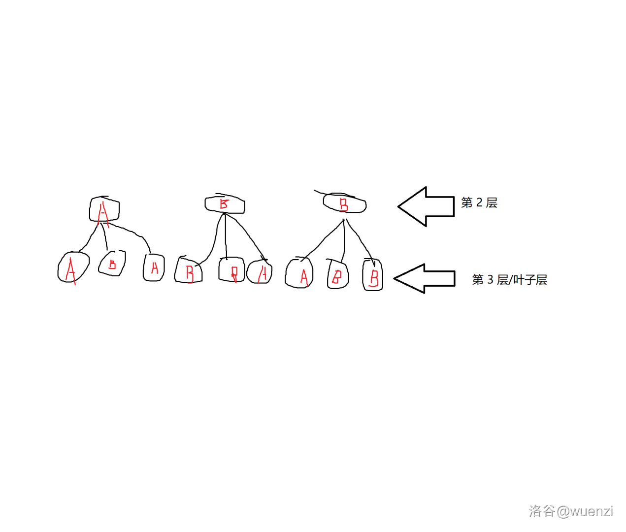 char build(int u,int d){ if(d==n){ w[cnt]=u;//第 cnt 个人的选择在树中的下标 return a[u].v=l[cnt++]; } a[u].l=3*u;//左 a[u].mid=3*u+1;//中 a[u].r=3*u+2;//右 map<char,int> v; v.clear(); v[build(3*u,d+1)]++; v[build(3*u+1,d+1)]++; v[build(3*u+2,d+1)]++; if(v['A']>v['B'])return a[u].v='A'; else return a[u].v='B'; }修改