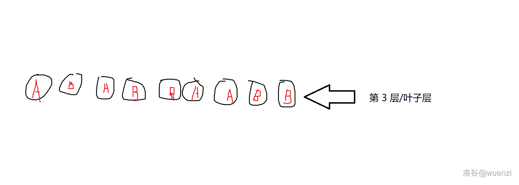 char qz(int u){ map<char,int> v; v.clear(); v[a[3*u].v]++; v[a[3*u+1].v]++; v[a[3*u+2].v]++; if(v['A']>v['B']){ a[u].v='A'; }else{ a[u].v='B'; } if(u==1)return a[u].v;//如果为根,直接返回 return qz(u/3); }完整代码