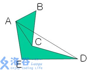 注意,用叉乘算的三角形DEA + 三角形 DAB的值是负的, 而叉乘算的三角形 DBC的值是正的,等价于去掉了重叠部分。