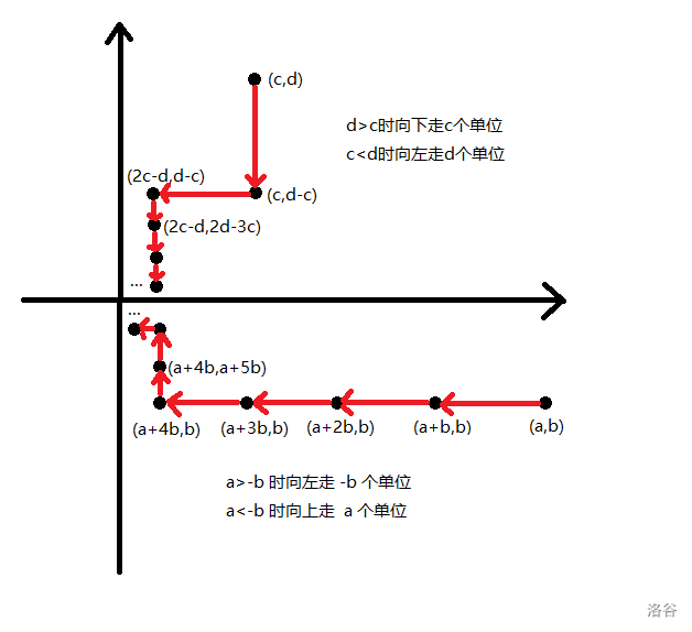 剩下的情况仅剩 同号, 同号。我们模拟从 出发的操作,因为不能让数改变符号,所以每一次只能是让绝对值大的数加上绝对值小的数。并且操作途中 的绝对值会不断减小。