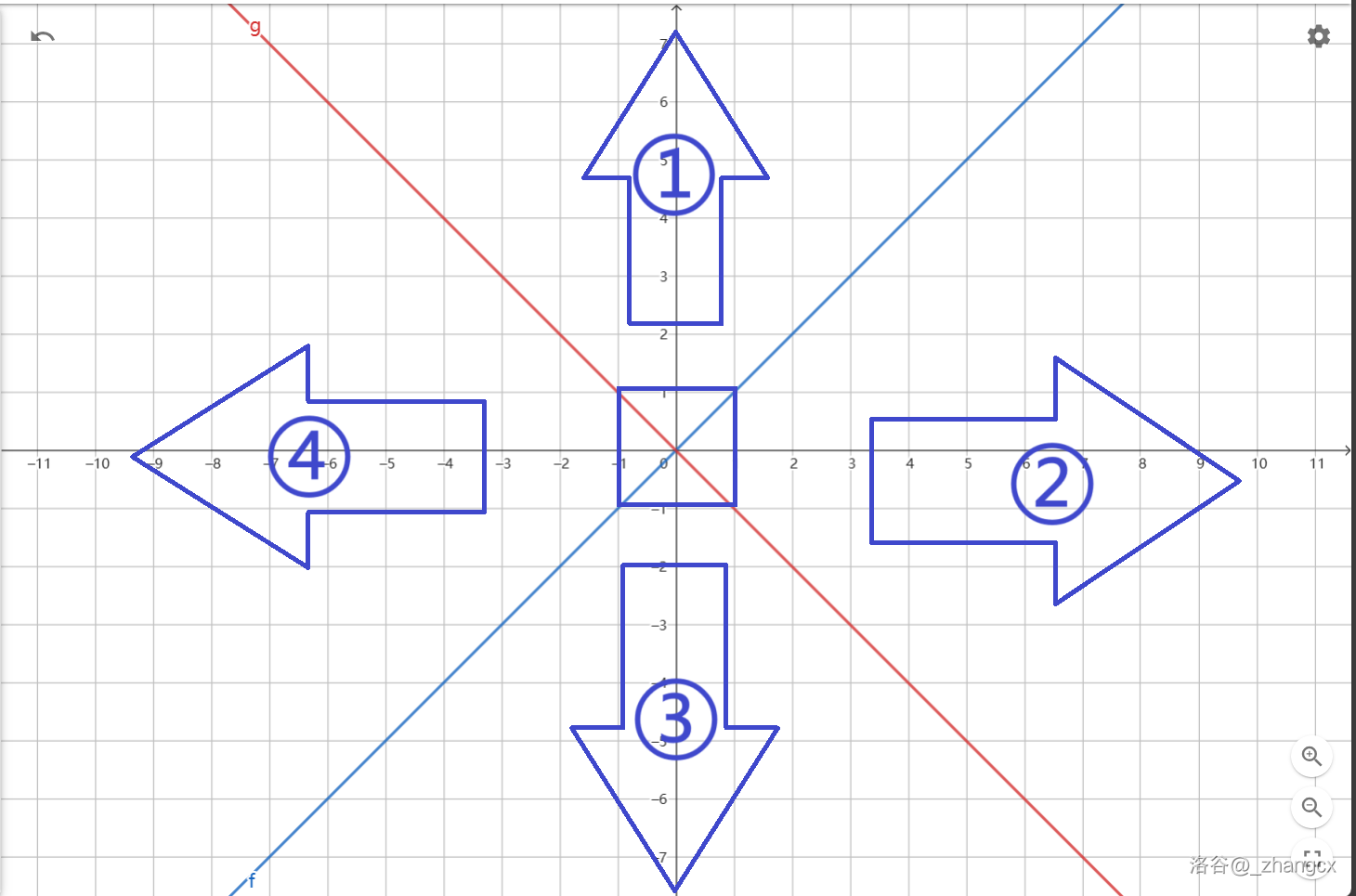 之后考虑方向问题。一个点的横坐标或纵坐标是否改变取决于它相较于这个操作的点在哪个区域。如图,中间的格子是某一操作的点,则在 或 直线上方格上的点会是斜着走一格,其余格子会按区域的箭头方向走两格。(由于工具所限,此图一个方格对应图中四个灰色小方格,请忽略坐标上的灰色数字,下同)