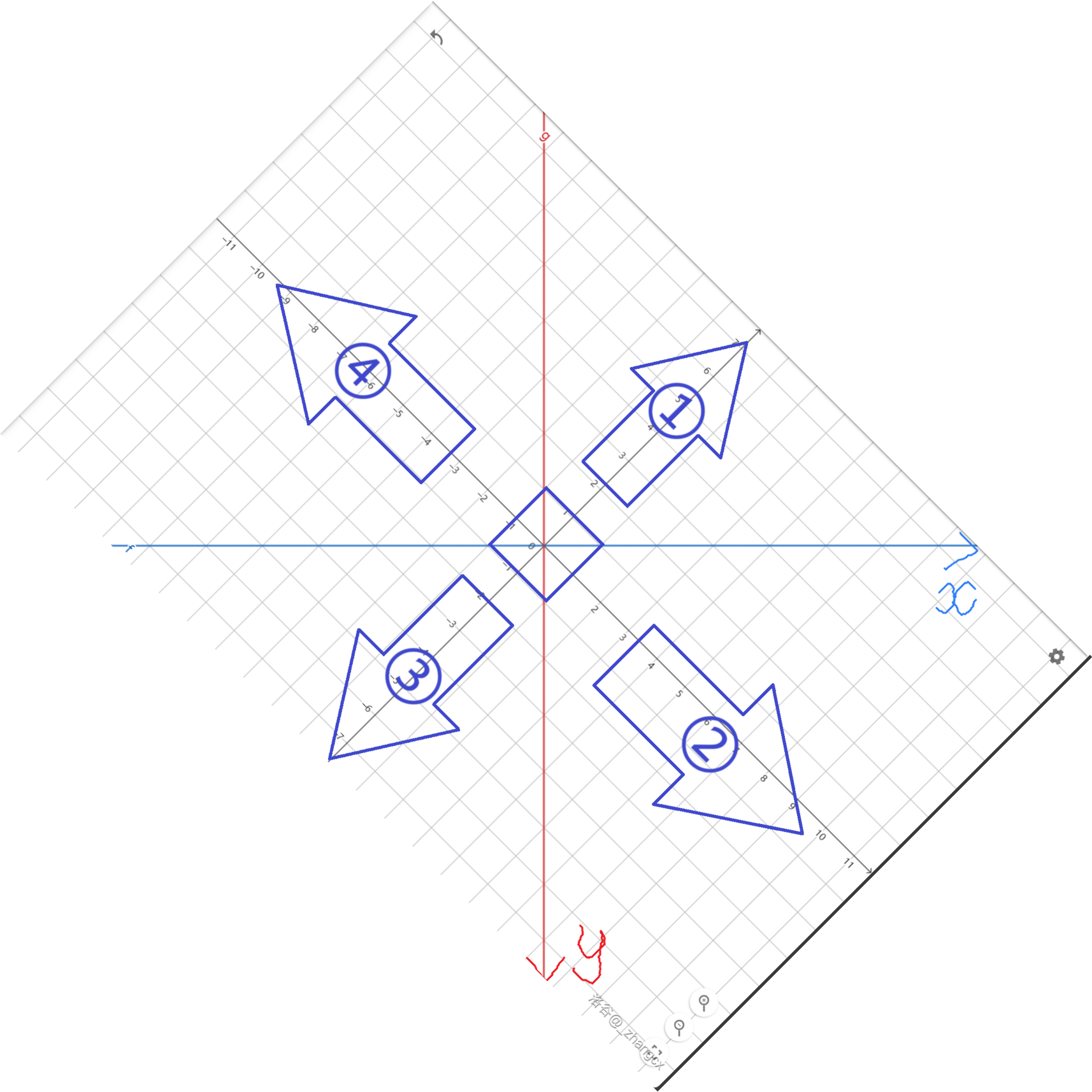 改为以浅蓝线为 轴,以红线为 轴建系。(你没看错,新建的 y 轴是倒着的)发现:对于一个操作,选定的点为 ,则所有横坐标严格比 小的点,横坐标减 2;所有横坐标严格比 大的点,横坐标加 2;纵坐标亦同理。