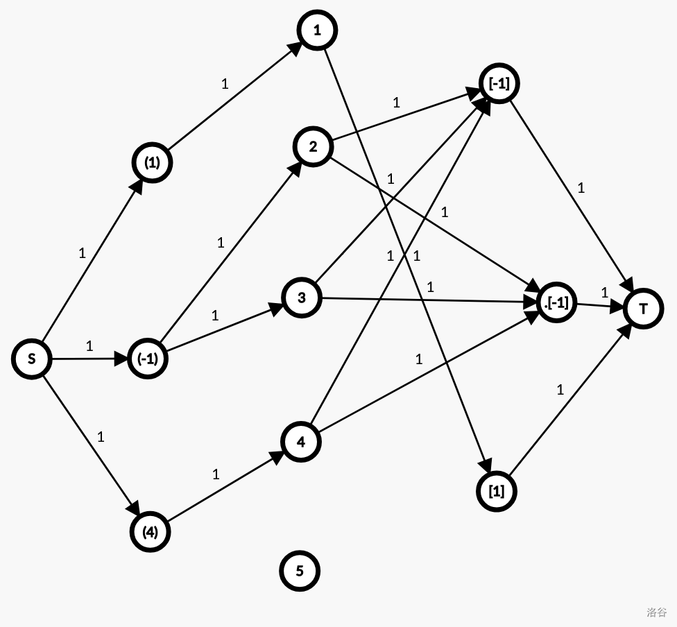 5 1 2 3 4 5 3 2 4 1 5 3 1 -1 4 -1 -1 1我们建的图如下(边权 = 流量):