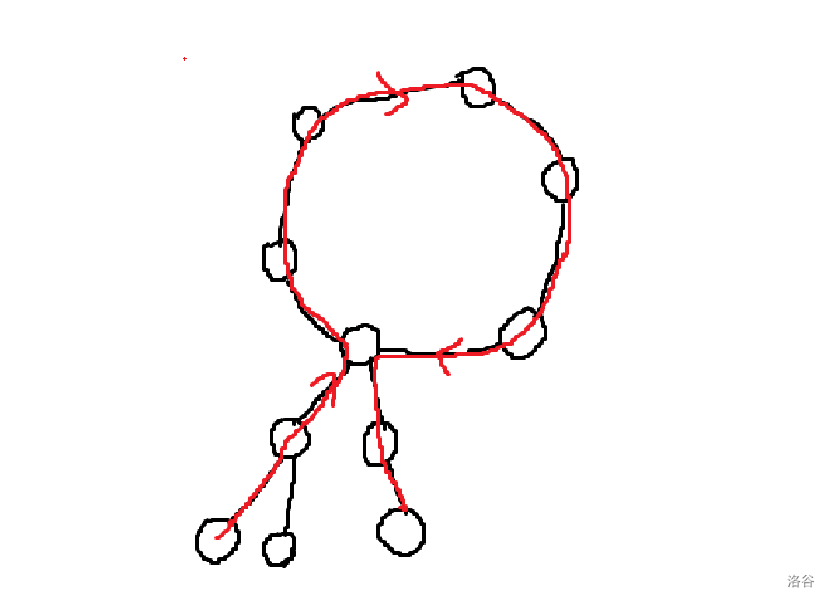 这种可以从环上一个子树内出发绕过环回到该子树,这明显不是基环树的直径,即环上权值和+某棵子树的根节点最长路径+该棵子树根节点的次长路径。特判完这种情况剩下的就是基环树直径板子了。接下来考虑基环树直径怎么求?首先基环树最经典的思路是把环上每个点当成一棵子树的根,将基环树拆成若干子树再进行分析。