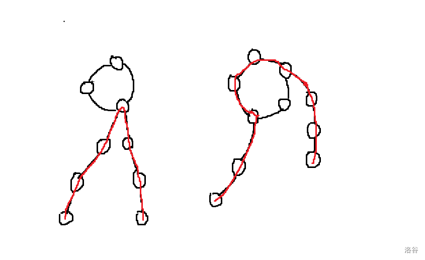 如上图,基环树直径分俩种情况,一种是挂在某一棵子树上,一种是经过某一棵子树的最长链再经过环走到另一棵子树的最长链。对于第一种情况就是求树的直径的经典求法,不会的同学可以做树的直径这题。不过我们需要先找到基环树的环对环上每个点当根求树的直径,预处理出每个节点当根的最长链(这我们后面考虑第二种情况需要用到),对于找环拓扑排序即可很容易求得。