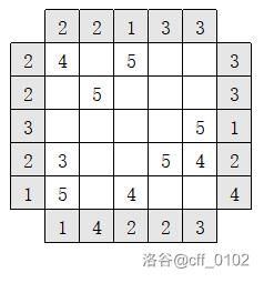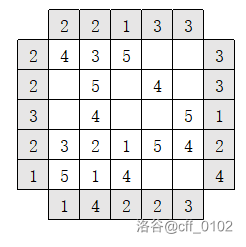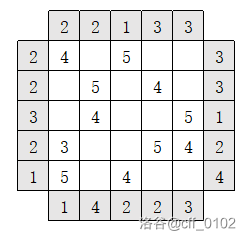 另外注意到第二列,上面能看到 个,下面能看到 个,这也唯一确定了这一列 的位置在第二行。再根据每行每列互不相同确定最后一个 的位置。