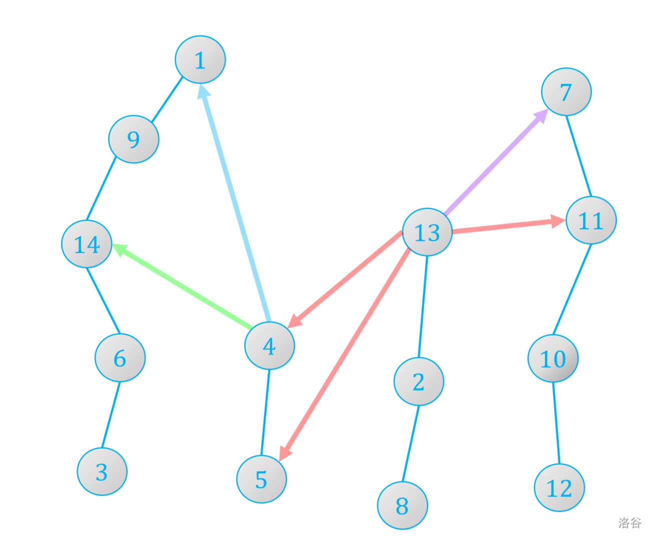 如图所示,我们只需要为每个不为 的链顶选一个父亲即可。首先每个节点的父亲都必须比自己高,不然就会违反长剖中的深度限制。如图中蓝色的连接合法,红色的连接不合法。但还要额外注意一点!如果某个点的父亲只比自己高 条边,那么这条边一定是往左连的,不然就会违反长剖中的链底编号限制。如图中绿色的连接合法,紫色的连接不合法。当然还要乘上分配编号的方案数,不过分配编号的方案很独立,在任何情况下都是 。