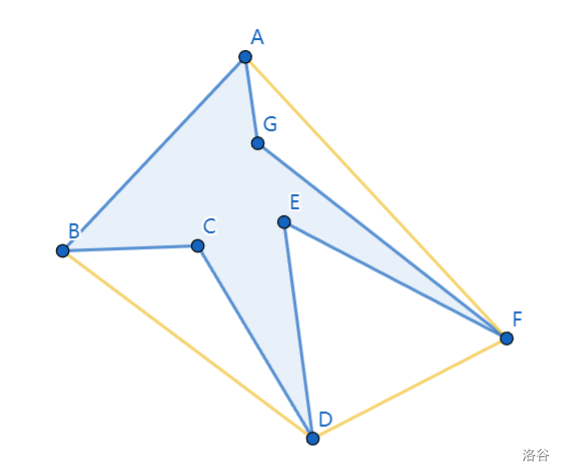 其中黄色加上线段 是这个假设棱堡的凸包,蓝色线段及其所围区域是假设的棱堡。