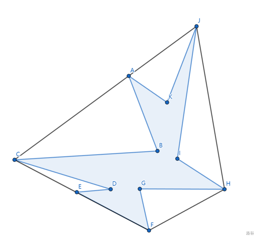 但是此时我们如果取线段 上的某一点 (不包含端点),要寻找另一点 形成火力直射时,由于顶点全部在线段 的一侧,使得棱堡形成的多边形区域也是集中在这一侧,导致线段 必然会穿过棱堡的内部区域形成火力盲区(上述解释可能有些抽象,建议自己画图加深理解)。