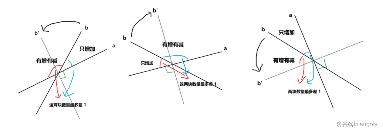 考虑 转动带来的变化,设其转动的锐角为 。注意到那两部分间必然存在一部分,到 的角度全部增加,且增加了 ;而另一部分中有增有减,并且变化的幅度都不超过 。由于数量相差不超过 ,以及 , 本身的增加,整体上是不减的。