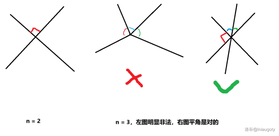 如果你发现不了的话,考虑归纳 / 增量法构造。 时我们已经会了,利用 时的最优解推出 的。首先考虑加入第 条直线,出现了 个 的情形,发现随便加(甚至跟已有的重合)都行;再加入第 条直线,出现了 个 的情形与 个 ,前者没啥要求,后者只需要保持使其与第 条直线垂直即可。