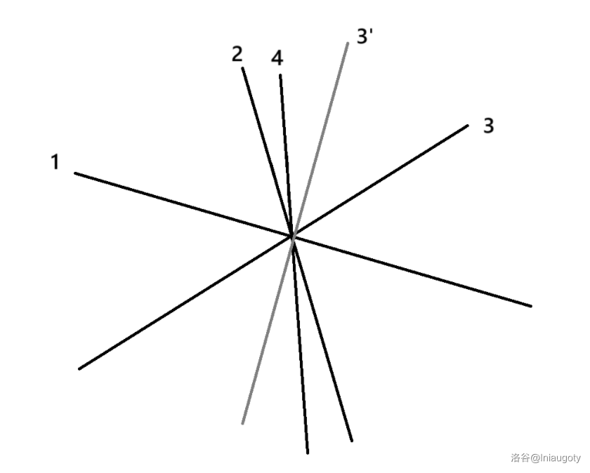 如图,直接让 3 来迁就 1 得到与其垂直的 3' 的话,它与 2 和 4 的夹角明显会变小,而这个减小的程度超过了与 1 夹角的增加。