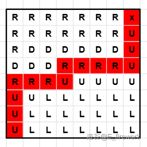 U和R构建出一条从左下角到右上角的路径,在这条路径的左上方只用R和D来填,右上方只用U和L来填,这样从不在路径上的格子出发可以在有限步内移动到路径上。那我们只需要保证路径左上方的格子数正好等于剩下的R和D的总数就行了。这是容易做到的。一种容易实现的方案是选取的路径先沿着左边缘向上,再向右穿过盘面,中间可能要再向上一步,最后沿着右边缘向上。