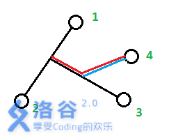 如果认为点4是从1~2的路径上分叉出来的,答案就会加上红色部分的长度。但是红色部分长度显然有一部分是多余的。只有认为点4是从1~3的路径上分叉出来的,才能加上正确答案(也就是蓝色部分)。
