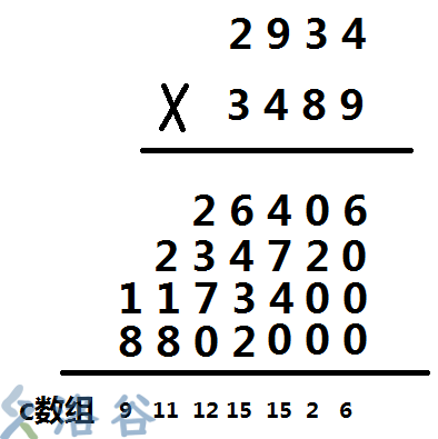 (和高精度加法一样);cin>>a1>>b1; int lena=strlen(a1); int lenb=strlen(b1); for(i=1;i<=lena;i++)a[i]=a1[lena-i]-'0'; for(i=1;i<=lenb;i++)b[i]=b1[lenb-i]-'0';接下来,不难想到,在计算乘法的时候可以使用两个循环进行枚举,以上面的图片为例子:外循环i为3489,内循环j为2934。