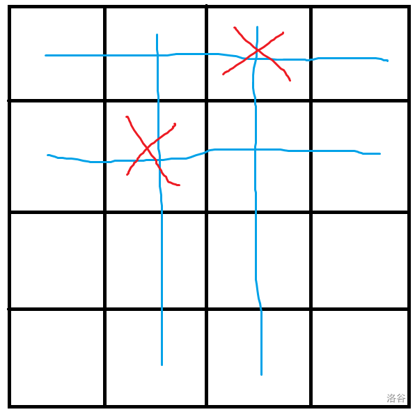 可是在现实中它有个缺陷,就是两个不能在同一行或同一列!所以,放置过木牛流马的同一行同一列需要标记去掉。(图中的蓝色线表示删除)