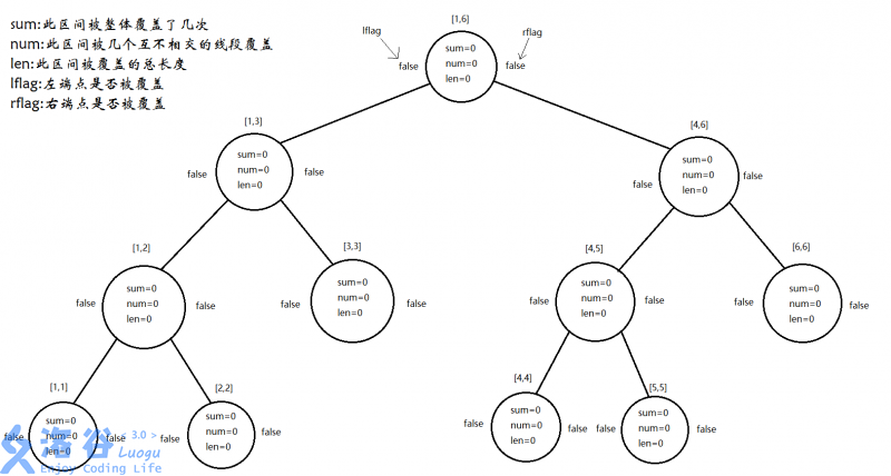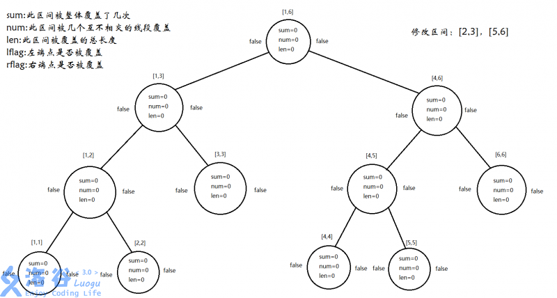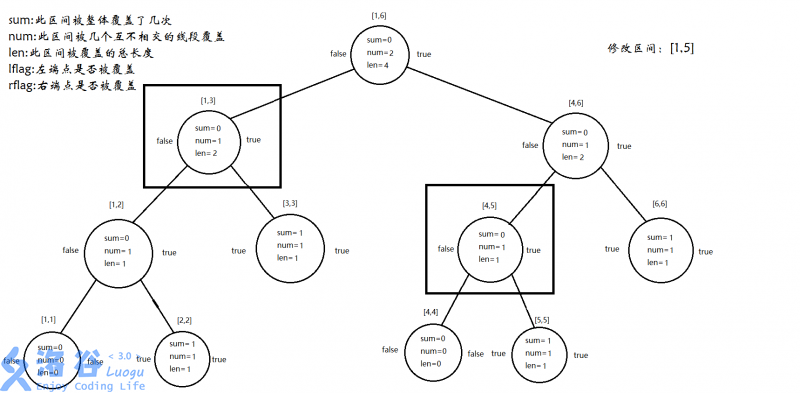 #define lson o<<1 #define rson o<<1|1 #define mid (l+r)/2 struct Tree { int sum;//整个区间被整体覆盖了几次(类似lazytag,但不下传) int num;//整个区间被几条互不相交的线段覆盖(比如,[1,2],[4,5]则为2,[1,3],[4,5]则为1(我习惯用闭区间),[1,4],[2,2],[4,4]也为1) int len;//整个区间被覆盖的总长度 bool lflag;//左端点是否被覆盖(合并用) bool rflag;//右端点是否被覆盖(合并用) }//如果不懂也没有关系,接着往下看那么pushup要怎么写呢?