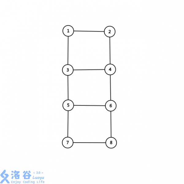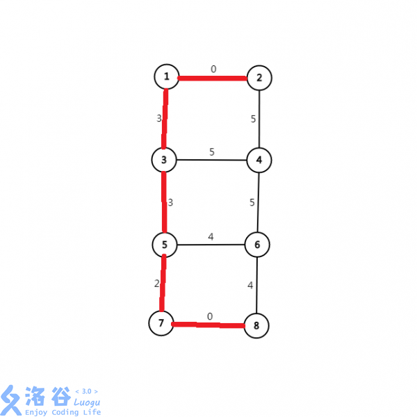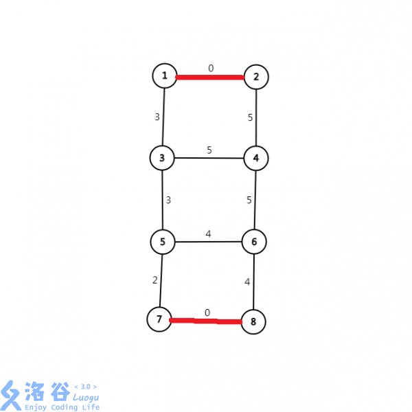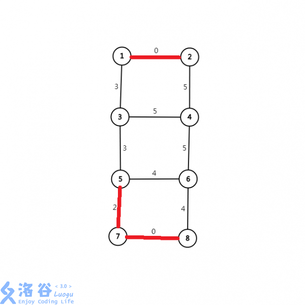 0,中间又不可能出现负权,所以我们的算法会首先选出这些边,因此可以认为这些点从一开始就是连通的,并且可以认为,将这两行都连通,就等价于将分别位于这两行上的任意两点连通。为了简便,我们将第一个点和第八个点连通。如图:红边表示已选边,黑边未选边