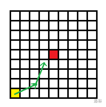 先考虑对角线的情况,图中红点是国王,黄点是骑士,绿色箭头是骑士的移动路线。