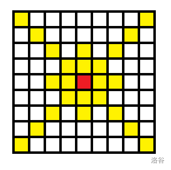 手玩一下这幅图(也可以写暴力来验证),可以得出结论:如果上车点在黄色点上,那么就一定会让国王走到上车点。