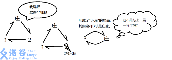 庄家还可能选择别的牌(还可能淘汰自己)。但是淘汰掉三人中的一个后,接下来的两人形成新环(庄主可能改变),所以可以直接从两人环的情况继承。