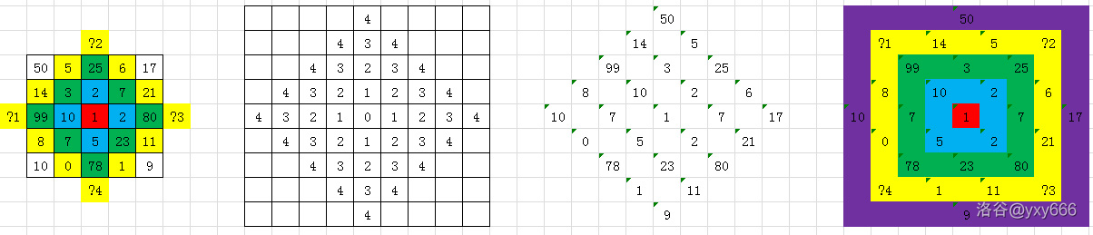 这道题的做法是旋图。 是的,你没有听错。因为直接模拟各种细节实在是太负杂了。但我我们把脑袋旋转45度后再看,就看舒服多了。使 的位置旋到 。