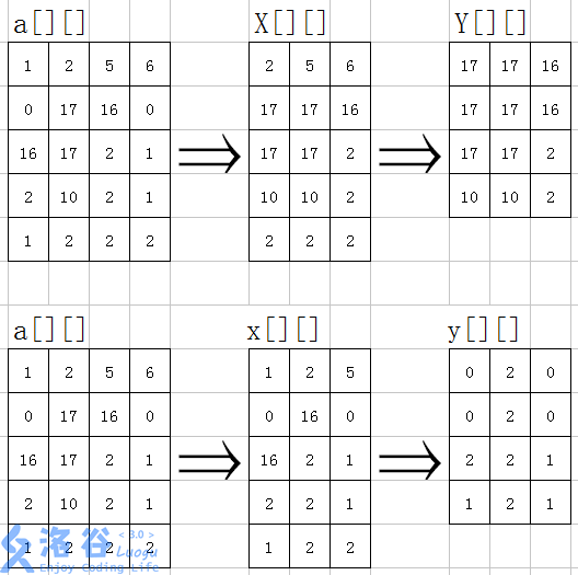 故Y[i][j]存储的实为以a[i~i+n-1][j~j+n-1]中的最大,即以i,j为左上角,边长为n的正方形中的最大值。同理,y[i][j]存储的即以i,j为左上角,边长为n的正方形中的最小值。