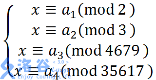 将因数分解,可得.那么把模数缩小,枚举的因数,然后运用定理把算出来,分别计算出对四个质数取模的结果,记为.