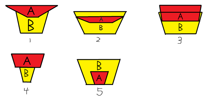 具体如何计算,我们用碗边斜率和上碗半径和下碗半径的值来分类讨论上面五个图,题解各神讲的很明白了。