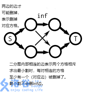 二分图内部的边,连接着互斥的点。边权全部赋为 ,以保证在最小割中不被删。啥意思?