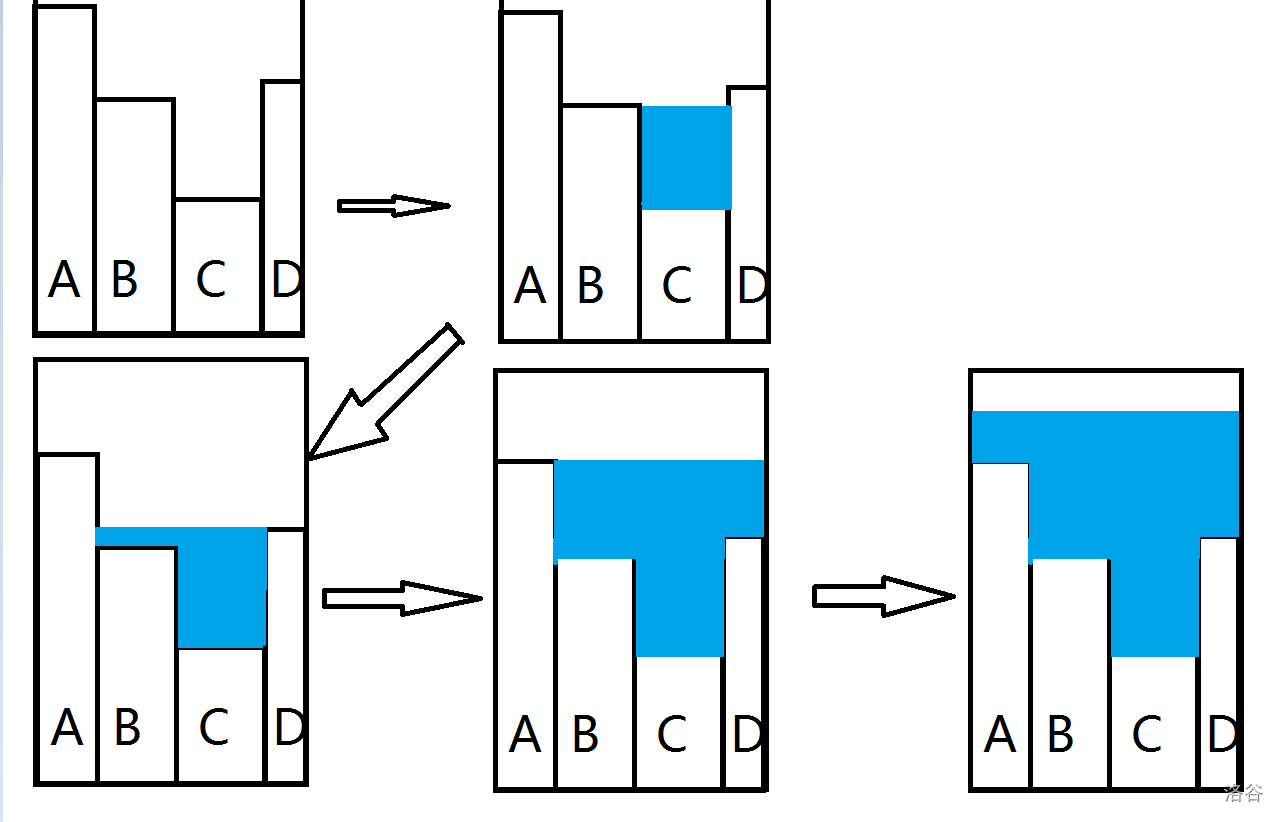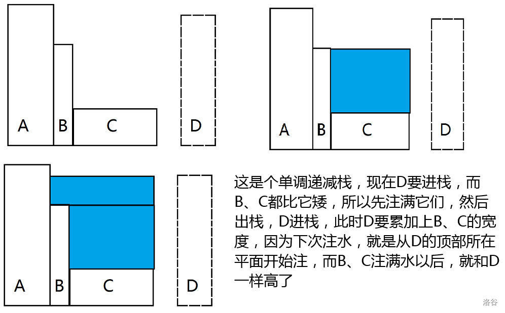 图中,两边无限高,而最矮,那么就从开始注水,当水位到达两边最矮的那个平台(也就是)顶部时,就注满了,接着开始出栈,移到右边,然后注(以此类推)。那么,实际上就是一个单调递减栈。
