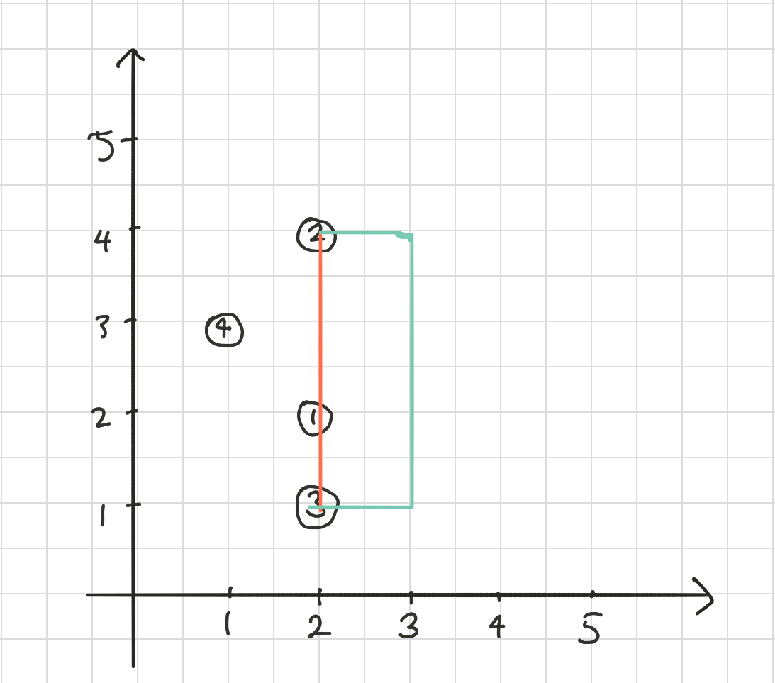 Farmer John有n个农场,编号为1到n,每个农场在二维平面上,有一个坐标。现在他想按照编号的顺序一次访问每个农场,从1号到2号,再到3号……最后从n号回到1号。每次只能从当前位置走到当前位置的上下左右四个点,每走一步需要花1分钟,每个顶点只能访问一次,问走完一圈回到1点的最短时间是多少。