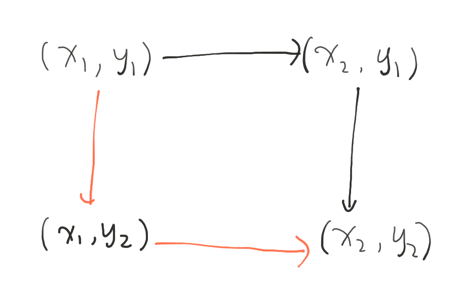 从(x1,y1)点走到(x2,y2)点,要么走黑色路径,要么走红色路径。每条路径可以拆成两个线段,于是又退化为点在线段上的判断。
