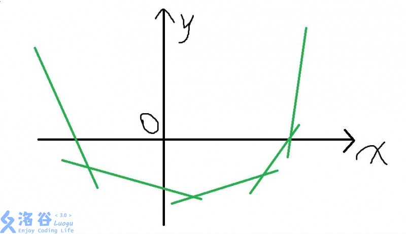 首先你画画图,发现一个性质:从上往下看能看到的图像一定是一个下凸的图像,像这样: