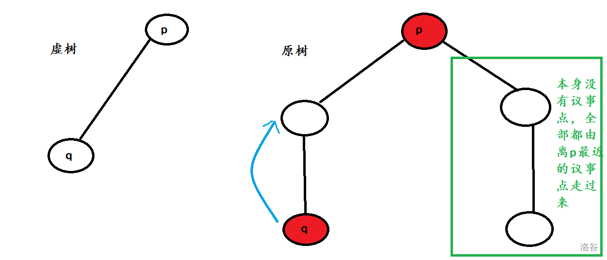 1、一个虚树点,如果它在在原树上的某个儿子,整棵子树都没有议事点,那么这颗子树的大小就能贡献到